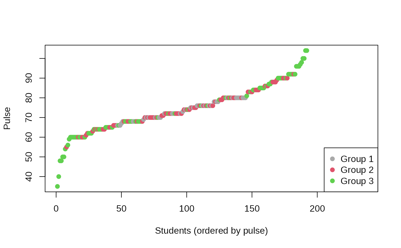 Pulse: pulse rate of student (beats per minute).Height: height of the student in centimetres.Age: age of the student in years.I will select these features as a new data frame and apply the default anticlustering method to create 3 equal-sized groups.